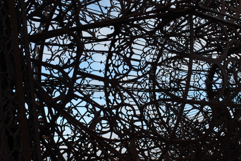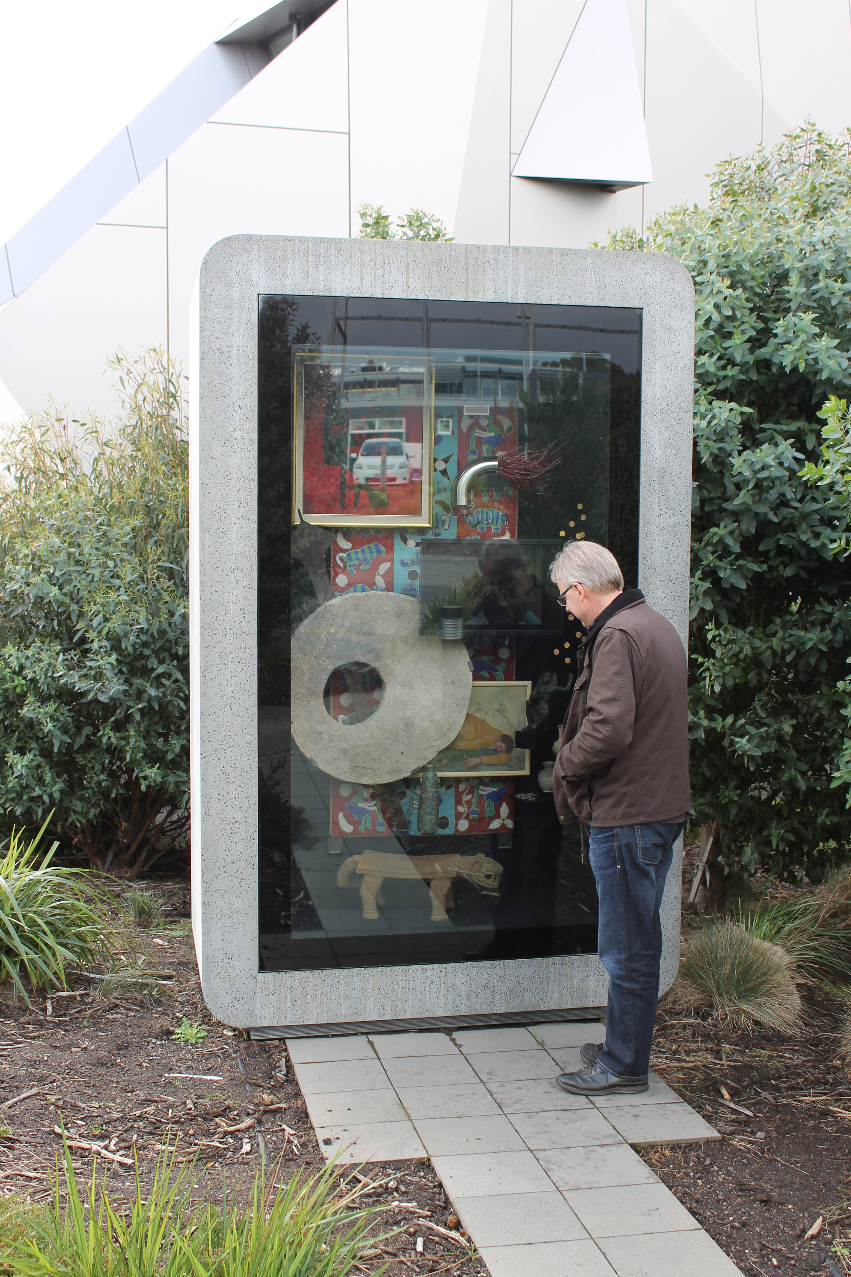 What greeted us upon arrival was a small collection of buildings around a tennis court with strange stools scattered about on the lawn, and a life sized cement mixer truck made entirely of steel cut in elaborate Gothic patterns. In front of a low building with a funhouse mirror facade stood uniformed MONA staff directing visitors inside to get their tickets and “O” guides. MONA is free if you’re Tasmanian, so the early morning crowd was an interesting mix of a few intrepid winter tourists and locals. Upon entering, we were quickly outfitted with guides, a map, and the suggestion that we start at the bottom of the museum and work our way up – another inversion of the usual museum experience. A glass elevator and spiral staircase led down into hillside, but since we were meeting Mary in the Library, which is on the lowest level, we decided to buck the trend and start at the top. And this is what we found.