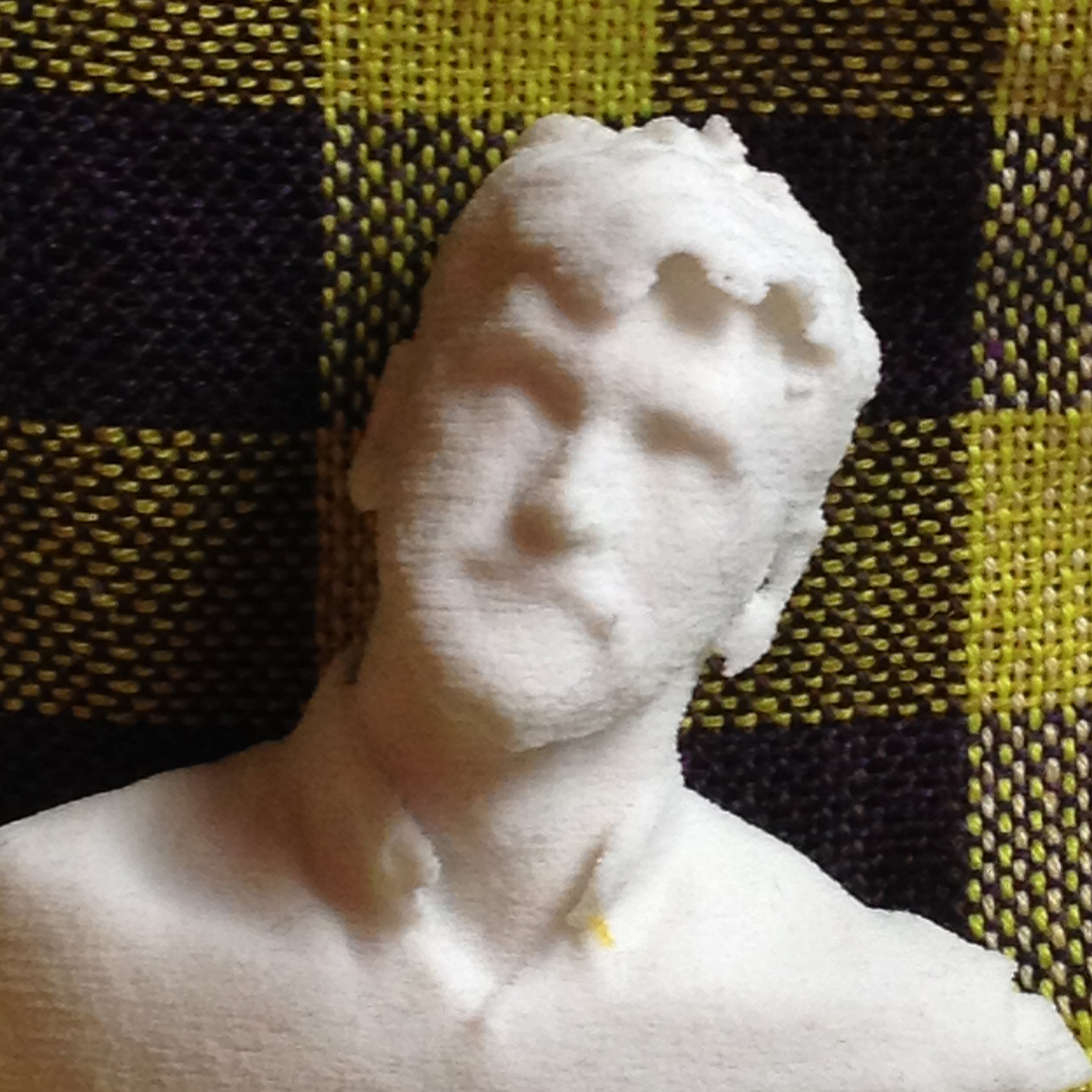 The other thing that always catches me by surprise it seems is how the strangest things you put out into the world will have life. My head scan, for instance. I did it mainly to test the scanner Don Undeen was using at the Met. I didn’t think so much of the resolution, but didn’t delete file luckily. I played with it as a way to explore TinkerCAD and the Shapeways 3D printing pipeline. When Simon Sherrin asked me for a copy, I figured I print one out for myself, mainly to see how long it took Shapeways to deliver and what their least expensive plastics looked like.