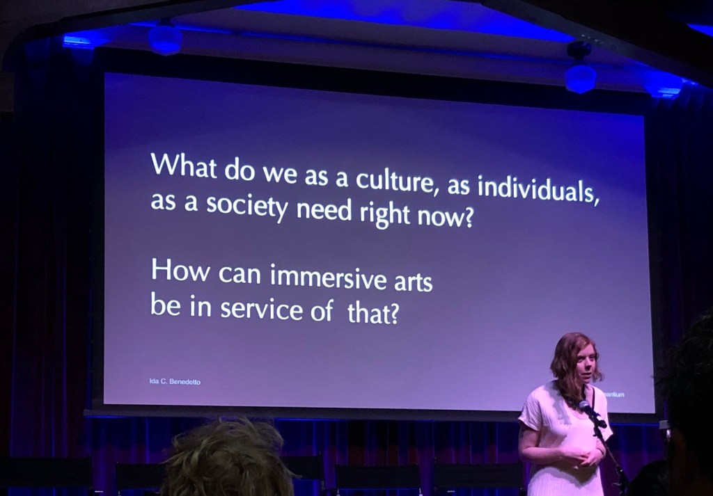 Jenny Weinbloom from MeowWolf (and formerly of Punchdrunk) was brought in to close out Day Two and she killed it with a high energy collection of provocations about creators and audiences and what makes a “good” audience. Using examples of her own rule breaking as an audience member, she pushed the audience to think about the inherently aggressive nature of immersive arts and what opportunities that provides creators to build what she called rehearsals for resistance. She asked, “Does the work that we’re creating have to have the same rules as the world that we’re living in?” Or could it strive to present alternate, better versions?